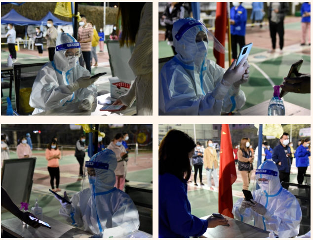 核酸采樣登記是核酸檢測工作中的重要一環(huán)。采樣登記處的“大白”根據(jù)采樣要求,以10人混檢為單位一一完成掃碼登記,仔細核對檢測人員信息。在封控的宿舍內(nèi),“大白”身披改裝挎包,一邊維持著現(xiàn)場秩序,一邊協(xié)助醫(yī)護人員掃碼登記,全力當好醫(yī)生“好幫手”。