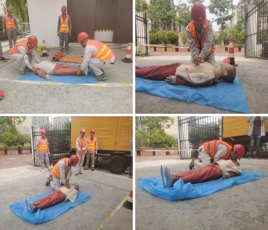 “快來人啊,有人觸電了!”,隨著一聲呼救,演練正式開始。演練人員按照預(yù)案,迅速采取各項應(yīng)急處置措施:立即斷開電源,移動觸電者,判斷觸電者意識,撥打120請求救援,向上級報告事故情況,開展臨時救護,采取“口對口人工呼吸法”和“心臟胸外擠壓法”對觸電人員進行急救。參演人員一一進行模擬操作,掌握動作要領(lǐng)。