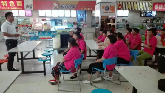 此次培訓(xùn)活動主要為保潔員普及夏季防暑降溫常規(guī)知識,以及中暑的現(xiàn)場急救措施。告誡保潔人員工作期間多飲水,并隨身攜帶公司發(fā)放的清涼油、藿香正氣水等夏季防暑物品,工作中一旦出現(xiàn)頭暈、惡心、口干、迷糊、胸悶氣短等癥狀時,應(yīng)立即停止作業(yè)并上報管理人員。